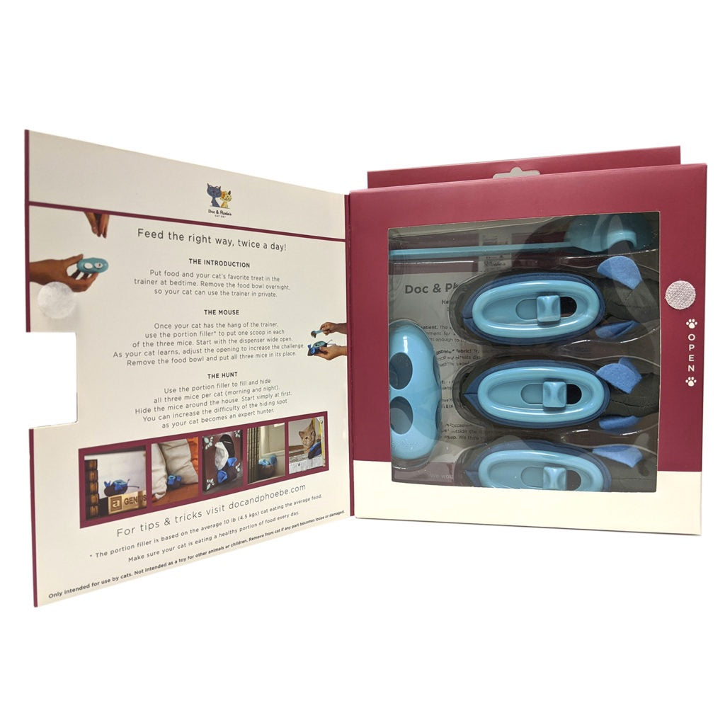 The bowl free, natural way to feed cats. To be happy and healthy, cats need to hunt, catch and play with three mice, twice a day. Helps solve obesity, scarf & barf, urinating outside of the litter box, night waking, boredom and destructive behavior. 100% veterinarian researched and recommended.