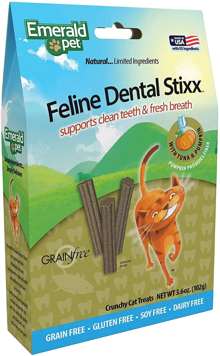 Emerald Pet Feline Dental Stixx are a premium line of natural cat treats formulated for optimal health and wellness. Family owned and operated ensures we provide you with the same high quality and standards we follow for our own pets!