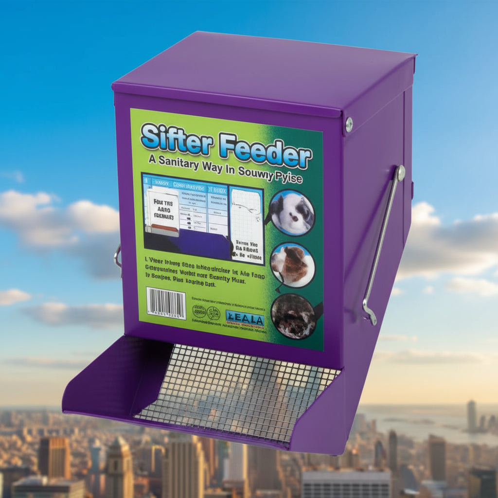 Our all metal powder coated chew proof sifter feeder with lid easily hangs on any cage. It reduces wasted food and helps keep the cage clean.
