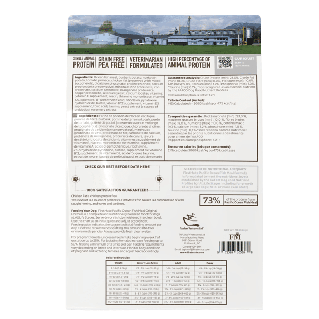 The protein breakdown of this formula is 73% from wild Pacific Ocean fish and 27% from potatoes. It is grain-free dog food, which makes it more easily digestible and great for dogs with food sensitivities and allergies. All FirstMate formulations are manufactured at their own plant which is located in Chilliwack, British Columbia.