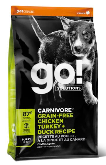 GO! CARNIVORE Grain Free Chicken, Turkey + Duck Puppy Recipe for Dogs is formulated to meet the nutritional levels established by the AAFCO dog food nutrient profiles for growth except growth of large size dogs (70lbs or more as an adult).