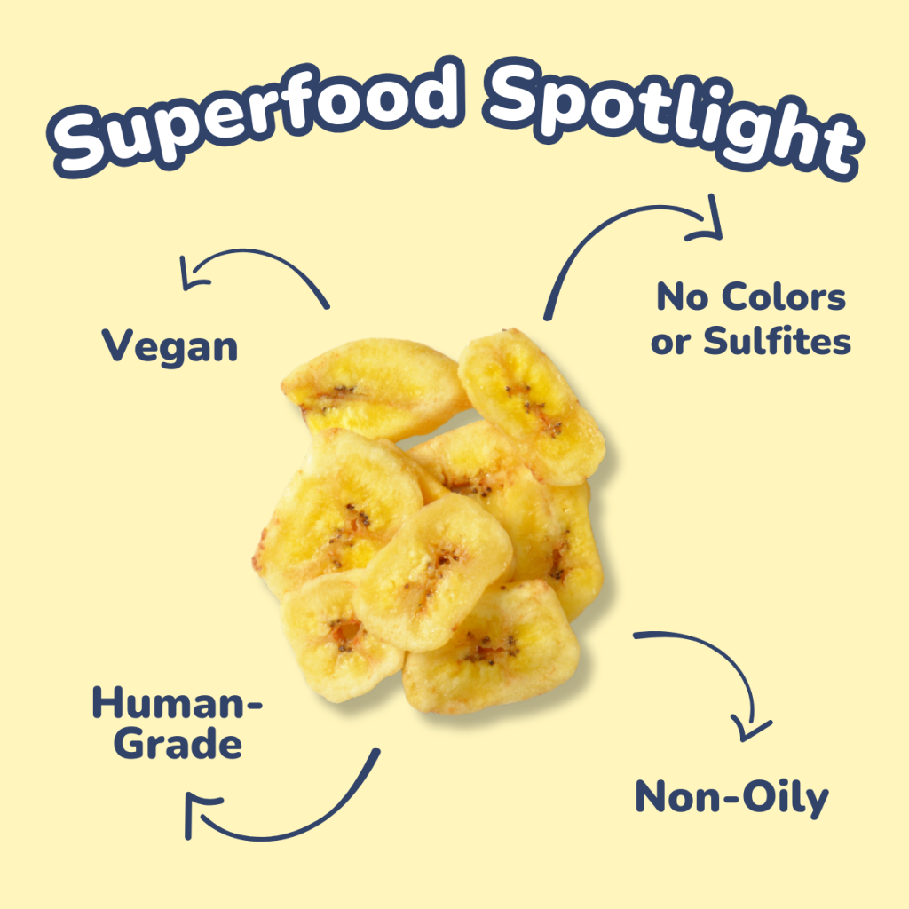 Healthybud’s best-selling banana chips are an all-natural, low-calorie treat for dogs of all stages and sizes! Coated with coconut oil to give an extra crunchy texture, these vegan chips are packed with potassium with no added sugar or salt.