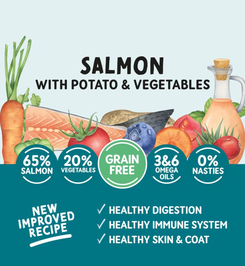 We are confident your dog will enjoy our delicious natural dog food recipe containing 65% Salmon and 20% Potato & Vegetables. Salmon is an easy to digest, lean, and vitamin-rich protein source. Salmon contains Omega 3 and Omega 6 fatty acids, which help towards a healthy skin and coat for your dog.