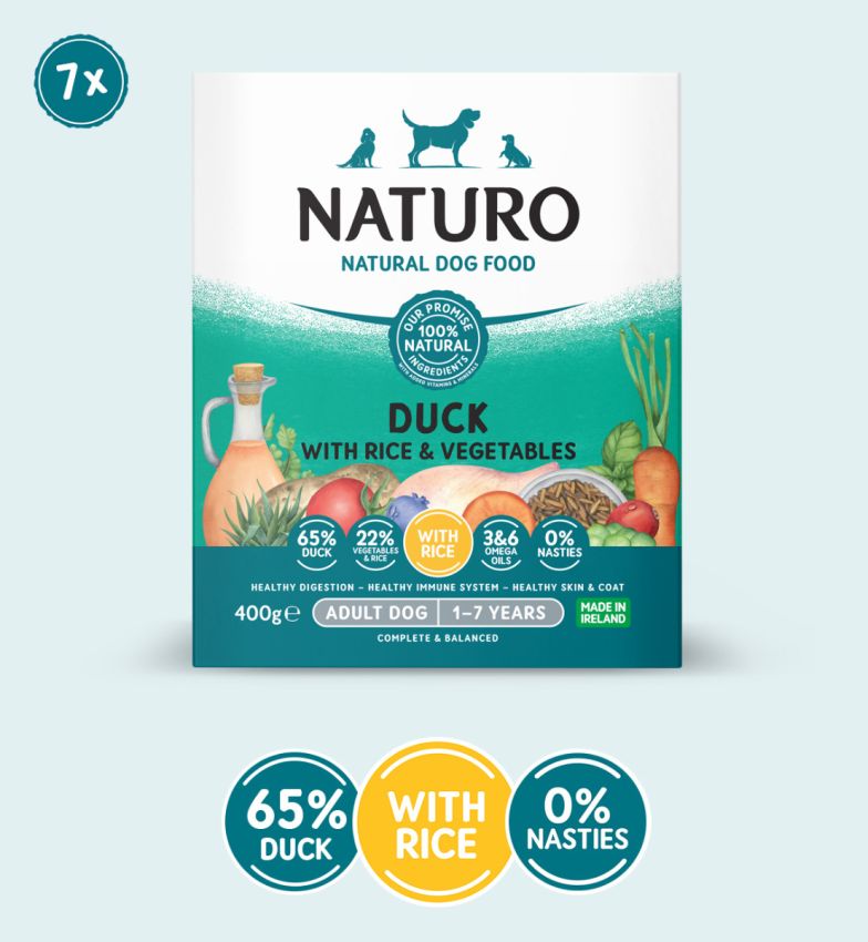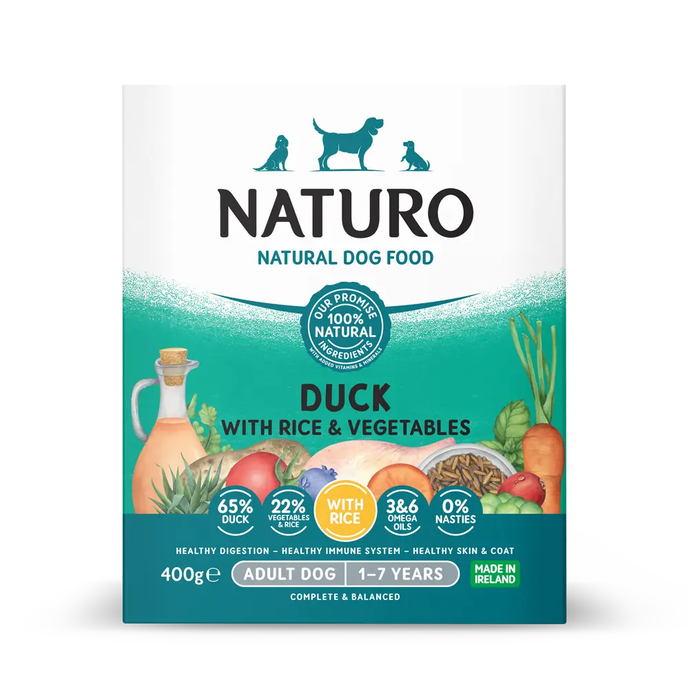 Our delicious Wet Dog Food contains 65% Duck, a premium protein and a great source of vitamins and minerals. Duck is an ideal alternative for dogs with intolerances to common foods. This Wet Dog Food also contains 10% Vegetables and 12.5% Brown Rice, allowing for an energy packed, easily digested meal. Omegas 3 and 6 are included in Sunflower and Salmon oils to help maintain healthy skin and promote a healthy coat for your Adult Dog throughout its life. Naturo contains 100% natural ingredients with added vitamins, minerals, and calcium to support your dog’s immune system, teeth, and bones. Our recipe contains no added artificial colours, flavours, or preservatives, providing the best natural, hypoallergenic dog food for your dog. Our premium, healthy dog food provides the best option for pet-parents who want nutritious and balanced meals to support their dog’s health and well-being at all life stages.