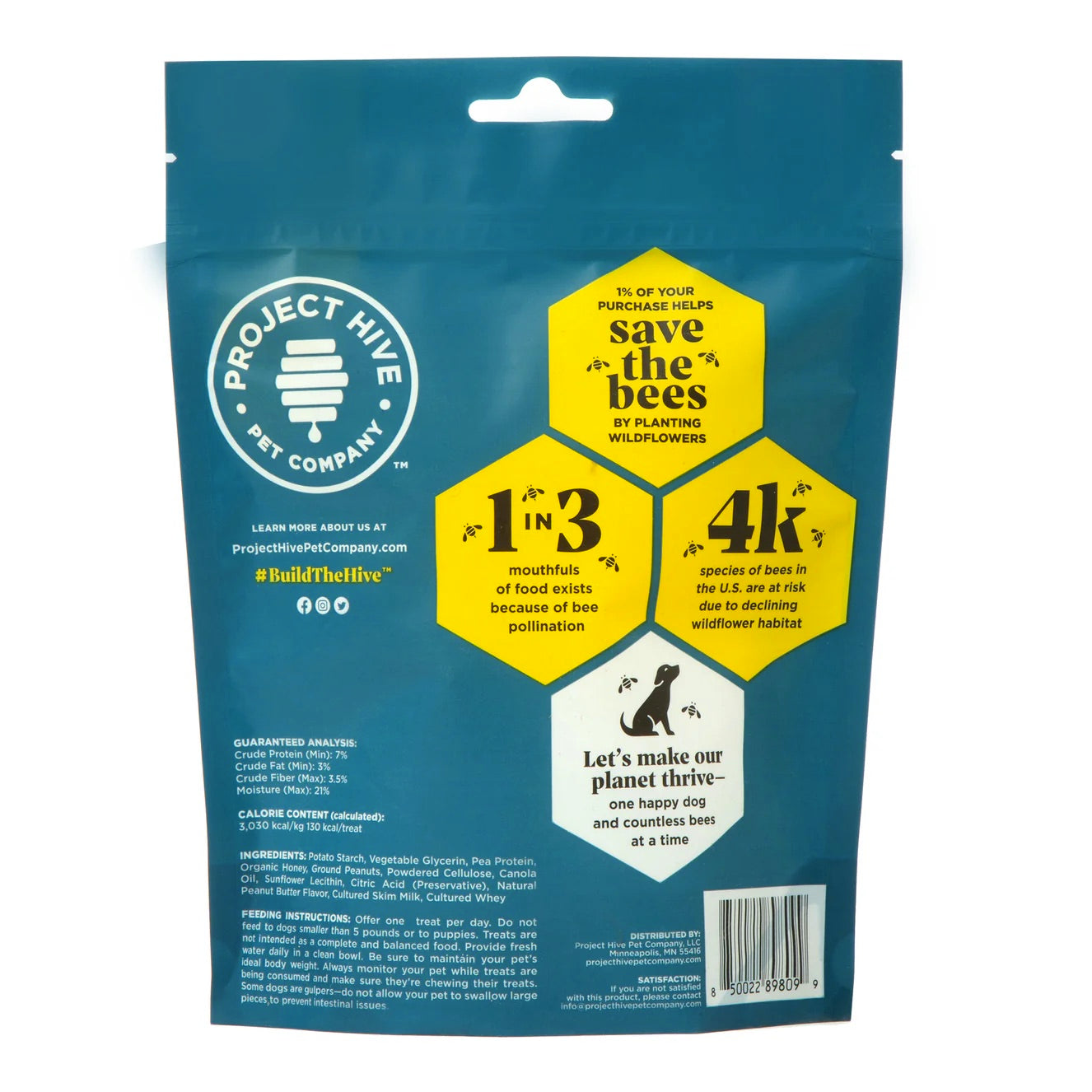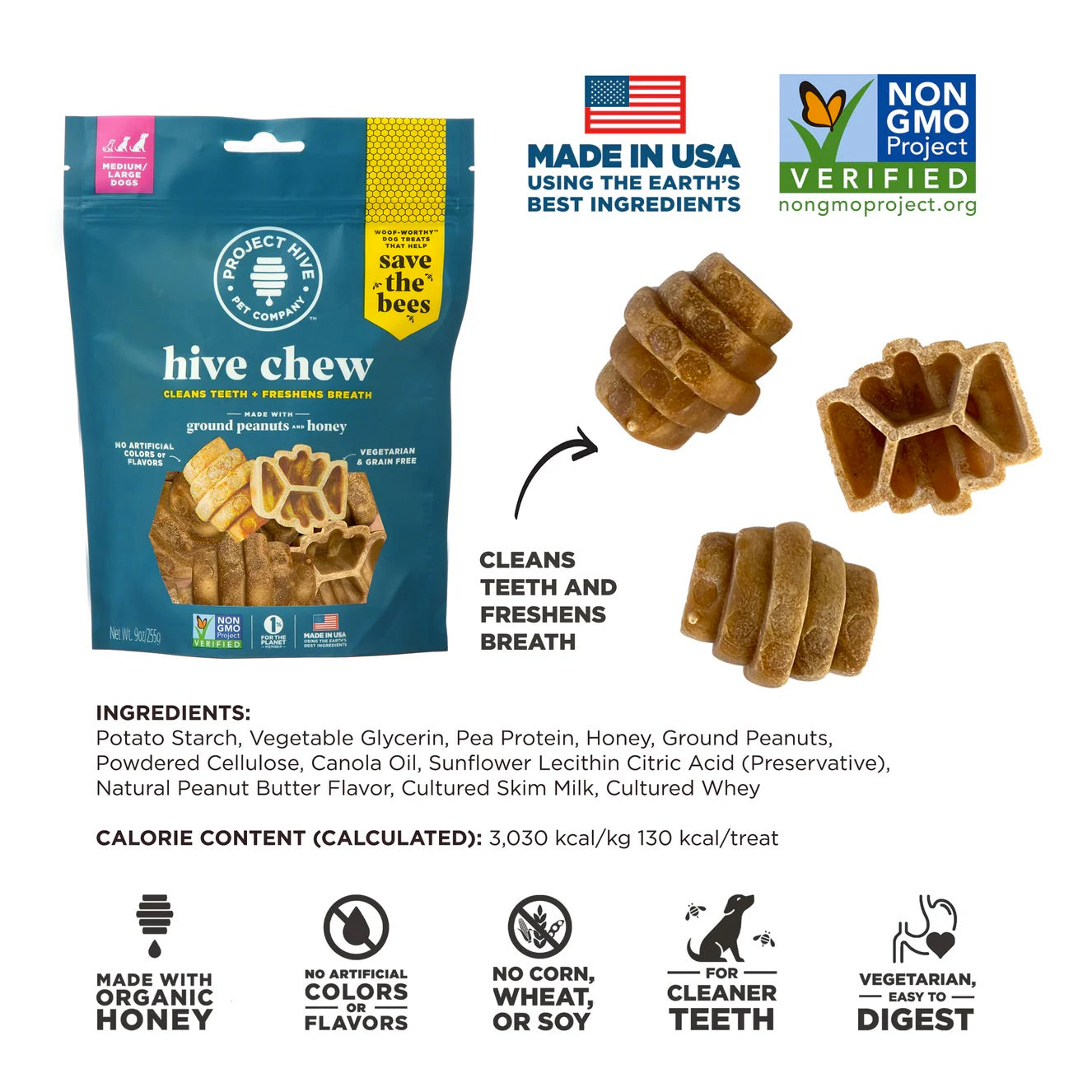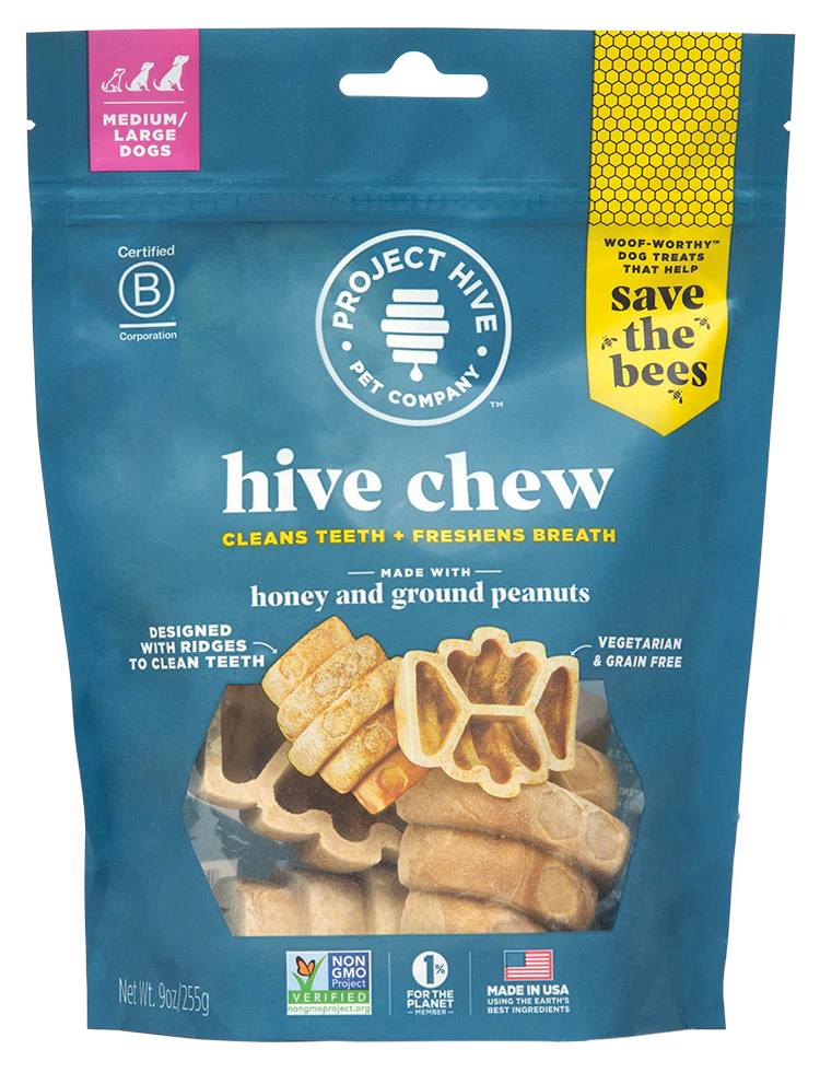 Hive Chews for medium to large size dogs are delectably crunchy treats with an irresistible peanut taste. Made in the USA with wholesome ingredients, our treats are Non-GMO Project Verified, vegetarian, and made with organic honey for a touch of sweetness from our worker bee friends. They are easy to digest, help freshen a dog’s breath and clean their teeth.