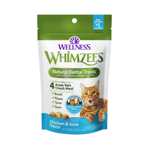 You brush daily, your cat should too! Wellness™ WHIMZEES® cat treats are designed to act like a toothbrush to help support the four areas vets check most - breath, plaque, tartar, and gums - all while they chew. Our scientifically crafted treats are complete & balanced for adult cats and taste great!